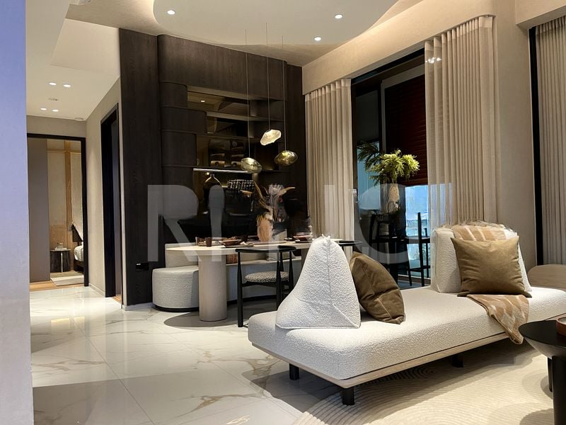 Step into a world of modern luxury as you enter this brand-new designer unit at The Hillshore. The open-concept living area greets you with stunning marble-look floor tiles, a curved sofa, and floor-to-ceiling windows that invite natural light and offer serene views of lush greenery. Designer pendant lights and integrated LED strip lighting enhance the ambiance, creating a warm and inviting atmosphere throughout.