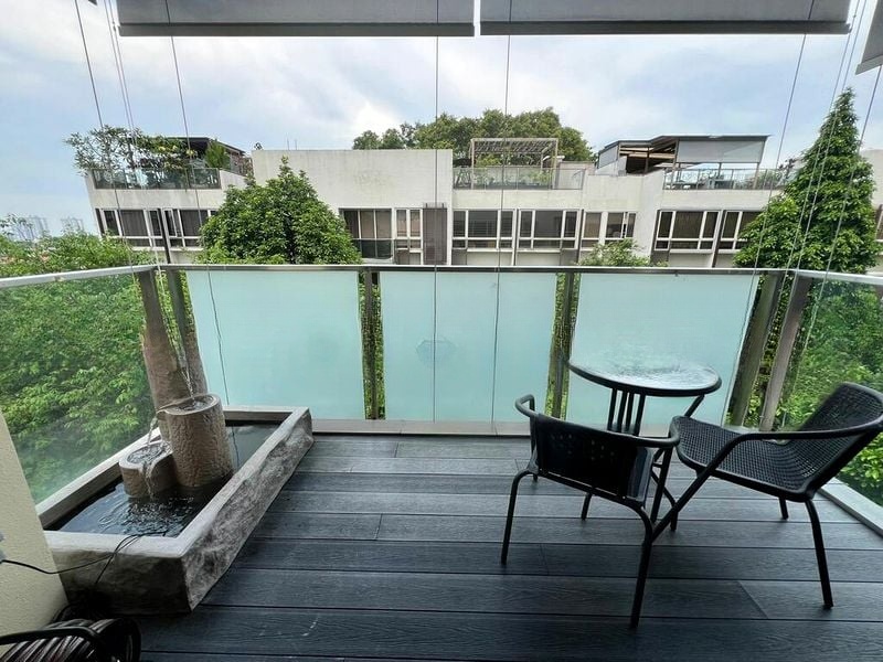 Highlights: - Private balcony with water feature - Dual workstation study room - Built-in full-height TV console - Modern minimalist finishes - City skyline night views