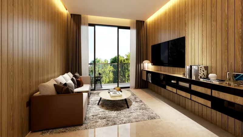 This efficient 1-bedroom layout features a seamless open-concept living area that flows effortlessly to a private balcony. The kitchen is a chef's dream, equipped with integrated appliances, sleek cabinetry, and under-cabinet LED lighting. The master bedroom boasts a full-height padded headboard and wooden flooring, while the bathroom impresses with wood-textured wall tiles and a glass shower screen, ensuring both style and comfort.