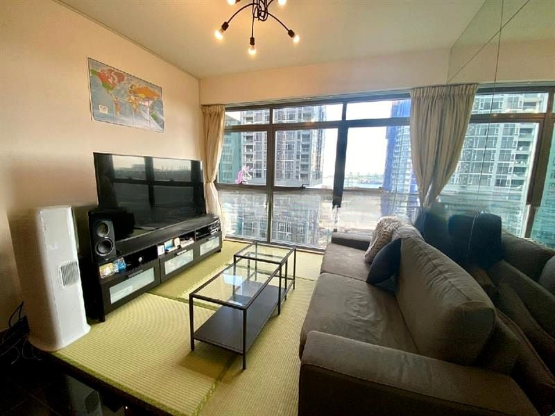 Step into a bright and airy sanctuary where abundant natural light floods through floor-to-ceiling windows, offering stunning views of the city skyline and lush greenery. The polished tile flooring and elegant pendant lighting create an inviting ambiance, perfect for both relaxation and entertaining.