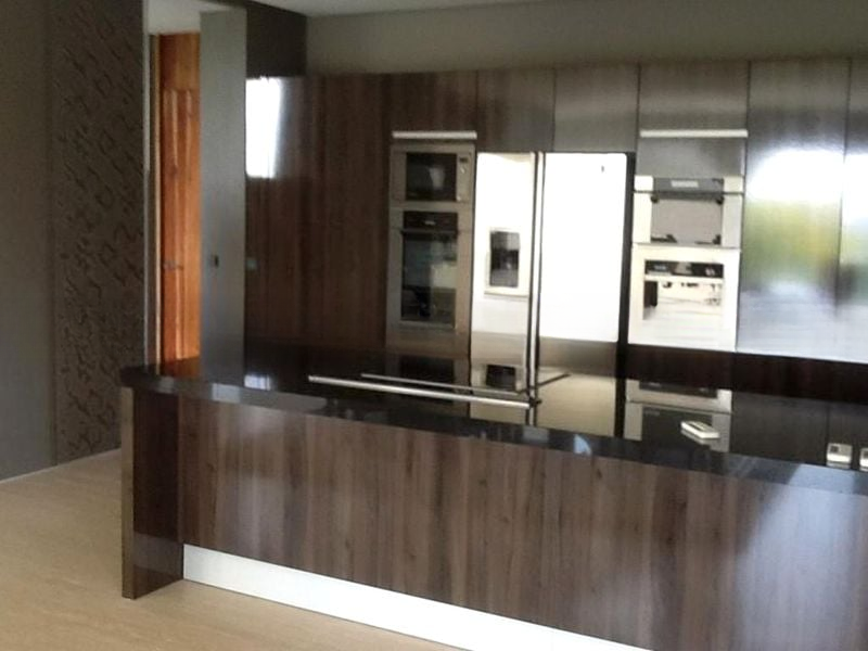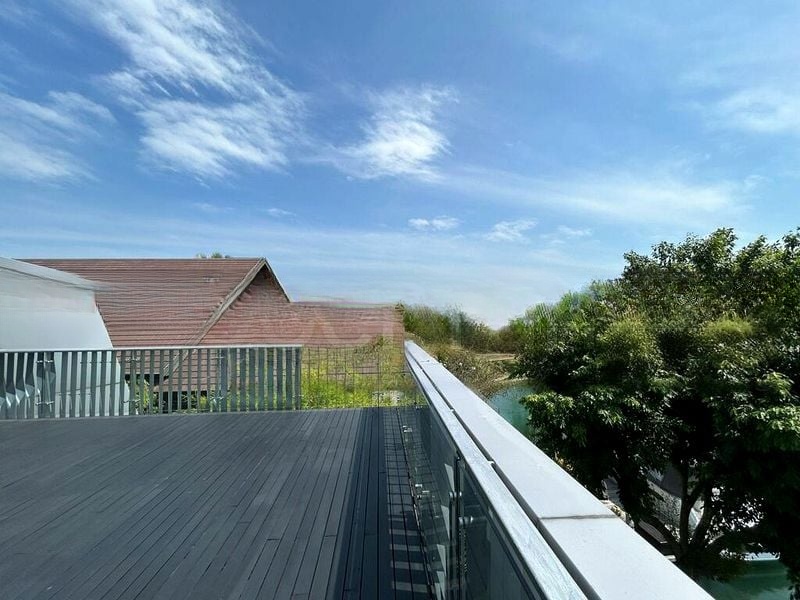 This exquisite 5-bedroom villa boasts standout features such as a glass-sided swimming pool, a striking spiral staircase with a mesh screen, and a walk-in closet with custom light wood cabinetry. Each room is thoughtfully designed, with warm wood flooring in the bedrooms and a spa-like bathroom featuring marble wall tiles and a glass shower enclosure. The expansive balcony with dark wood composite decking offers the perfect outdoor retreat, ideal for entertaining or relaxing.