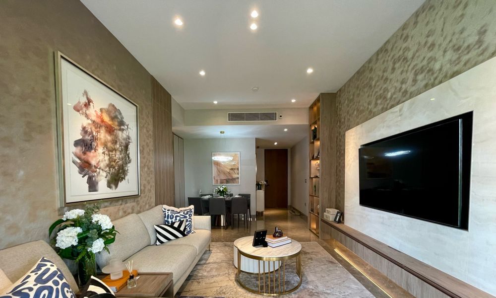 This efficient 122 sqm (1313 sq ft) unit features an open-plan living and dining area seamlessly integrated with a modern kitchen, complete with a striking black marble island and bar seating. The spacious master suite boasts wood paneling and mirrored walls, while the outdoor patio lounge invites you to unwind in lush greenery. Enjoy the designer touches throughout, including recessed ceiling lighting and a stunning chandelier in the dining area.