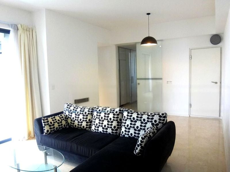 This well-maintained 2-bedroom, 2-bathroom unit features a modern galley kitchen equipped with white cabinetry, a gas hob, and an integrated oven, perfect for culinary enthusiasts. The spacious living room, adorned with pendant lighting and an L-shaped sofa, seamlessly connects to the balcony, while the bedrooms offer built-in sliding wardrobes and minimalist designs that enhance the overall aesthetic. The bathrooms boast marble-look wall tiles and contemporary finishes, ensuring a luxurious experience.