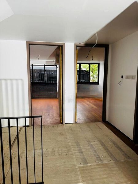 Step into a world of elegance as you enter this brand-new home, where abundant natural light floods through large black-framed windows, illuminating the polished wooden flooring and creating a warm, inviting ambiance. The double-volume ceiling void enhances the spaciousness, while the modern minimalist design, accentuated by glass railings and sleek black metal staircase railings, offers a sophisticated touch.