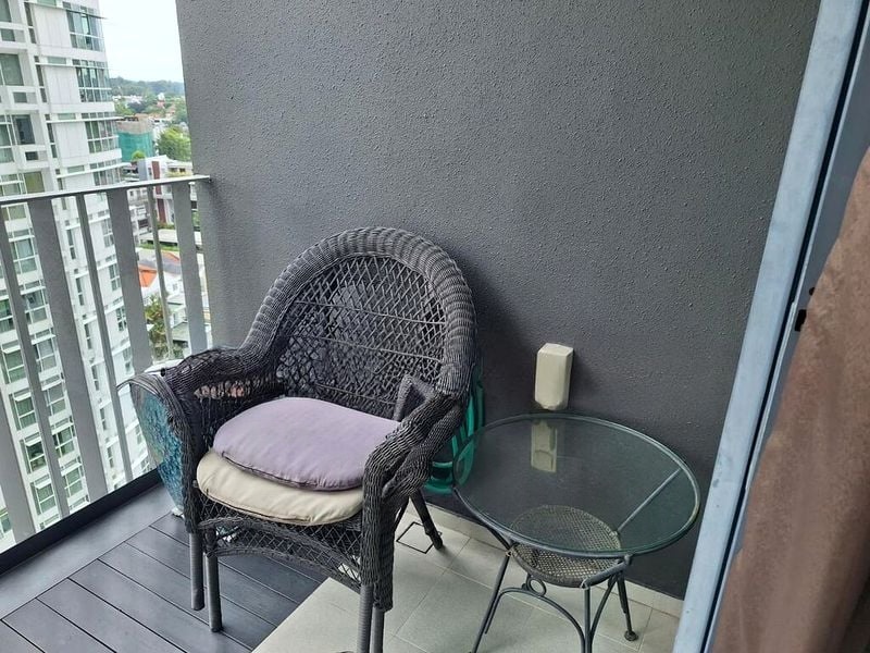 This well-maintained 2-bedroom, 2-bathroom condo features standout spaces including a stylish kitchen with white minimalist cabinetry and integrated appliances, a luxurious bathroom with a bathtub boasting city views, and a cozy study area perfect for remote work. The living room, adorned with an elegant chandelier, seamlessly connects to the dining space, creating an ideal setting for entertaining.