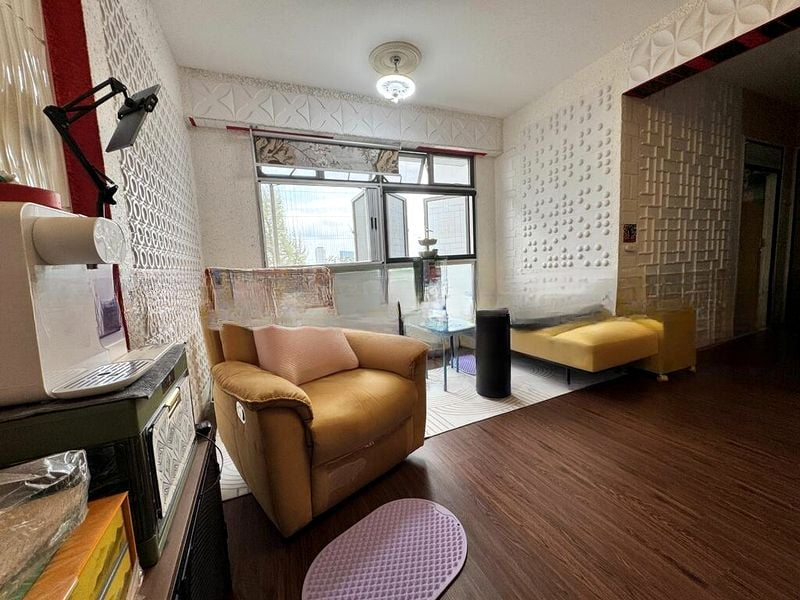 The layout is thoughtfully designed, showcasing a spacious master bedroom complete with a tufted headboard and a full-height wardrobe, while the common bedroom maximizes space with a pull-out trundle bed. The L-shaped kitchen is a chef's delight, equipped with wood-look laminate cabinetry and integrated features for convenience. Enjoy the practicality of a service yard that houses laundry amenities, ensuring a seamless living experience.