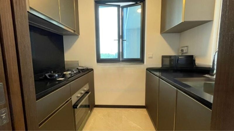 This well-maintained condominium features an open-concept living and dining area that seamlessly connects to a balcony with panoramic views. The galley kitchen is equipped with a built-in oven and gas hob, complemented by dark stone countertops and a window for ventilation. The master bedroom offers a serene retreat with wooden flooring and expansive windows, while the dedicated study nook provides a perfect workspace bathed in natural light. The bathrooms are elegantly designed, featuring glass shower enclosures and rain shower heads.