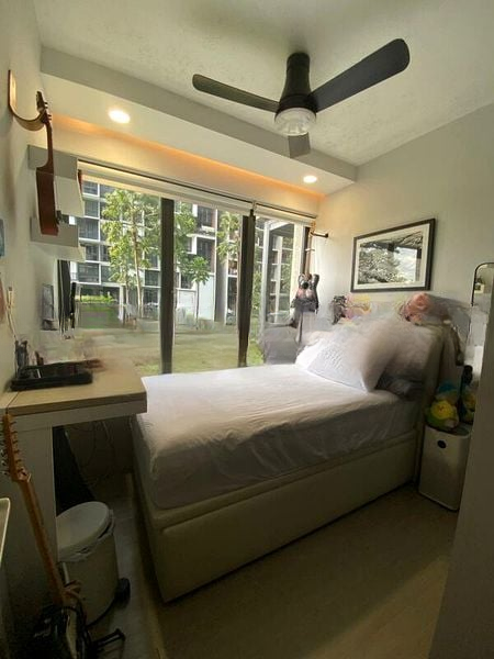 This well-maintained 4-bedroom, 3-bathroom condo features a spacious layout with standout rooms including a master bedroom equipped with a wall-mounted TV and a cozy red armchair. The modern bathroom boasts a walk-in shower with a glass partition, while the dining area showcases a chic 4-seater set under stylish triple pendant lights. With built-in storage cabinetry and ceiling fans throughout, every detail has been thoughtfully designed for comfort and functionality.