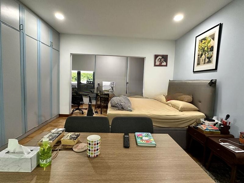 This well-designed unit boasts a spacious layout, featuring a dedicated piano area that adds a unique touch to the living space. The master bedroom, with its stylish wooden slat feature wall and en-suite feel, offers a private retreat, while the common bedroom serves as a versatile space complete with floor-to-ceiling built-in wardrobes, perfect for study or exercise.