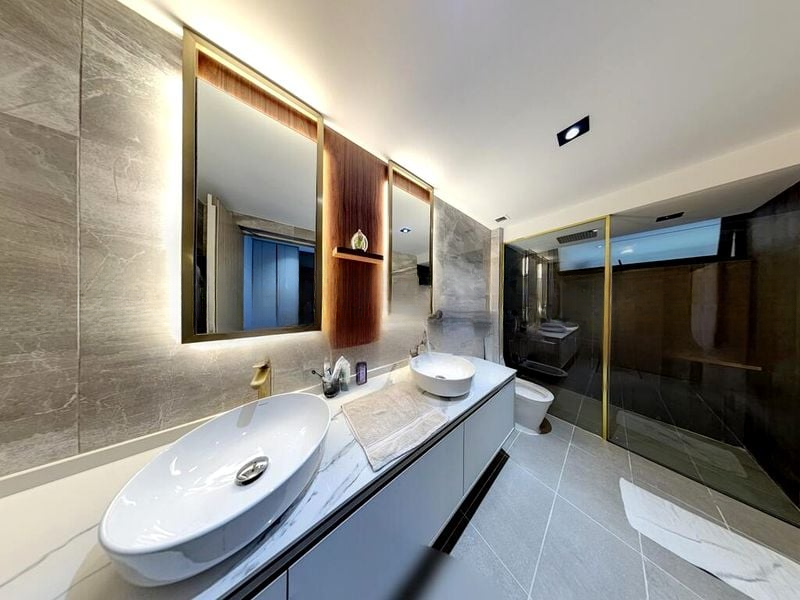 Step into a world of luxury as you enter this brand-new duplex penthouse at SIGLAP V. Bathed in natural light, the open-concept living area features designer pendant lighting and floor-to-ceiling glass walls that invite the stunning views of the pool, greenery, and city skyline right into your home. The ambiance is bright and airy, creating a perfect sanctuary for relaxation and entertainment.