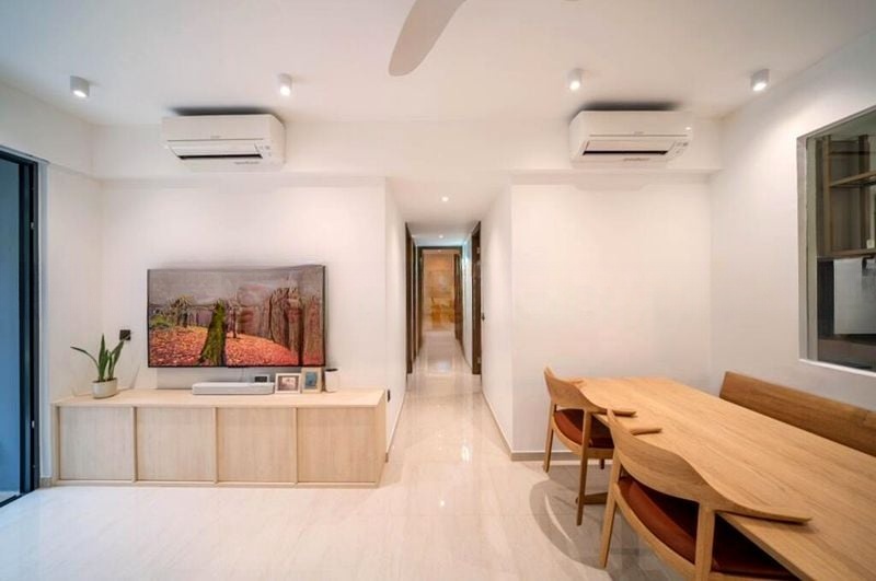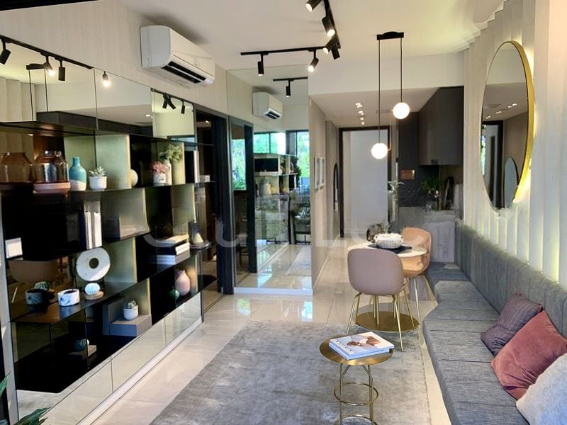 Step into a sanctuary of light and tranquility at Riverfront Residences. The moment you enter, you are greeted by polished tile flooring and an abundance of natural light streaming through large windows. The open-plan living area, adorned with a woven pendant light, seamlessly connects to a private balcony, offering serene views of lush greenery that invites relaxation and peace.