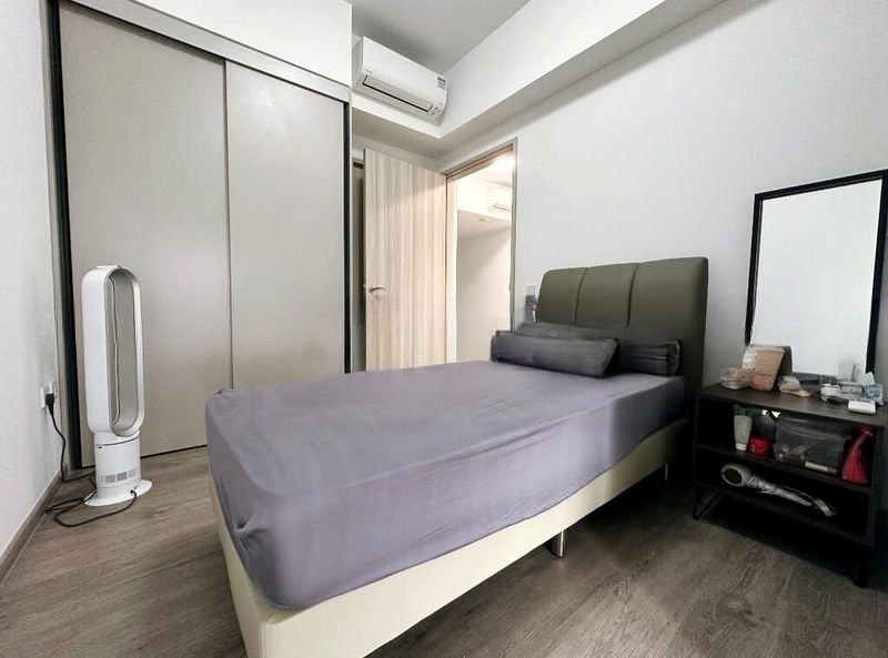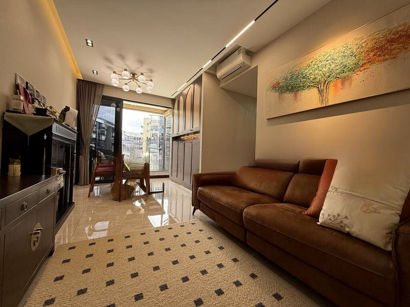 Step into a serene oasis at Sengkang Grand Residences, where modern minimalist design meets unblocked greenery views. The living room welcomes you with large format floor tiles and seamless access to a private balcony, perfect for enjoying the city skyline and park vistas. Natural light filters through sheer and blackout curtains, creating a warm and inviting ambiance throughout the unit.