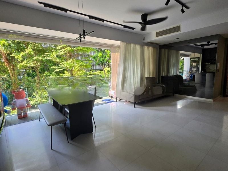 Step into a world of modern elegance as you enter this beautifully designed unit at Cairnhill Residences. The abundant natural light floods through the floor-to-ceiling glass doors, illuminating the open-concept living area adorned with a striking mirrored feature wall and a luxurious marble-look TV feature wall. The ambiance is enhanced by fluted wall panels and designer ceiling fans, creating a serene and inviting atmosphere.