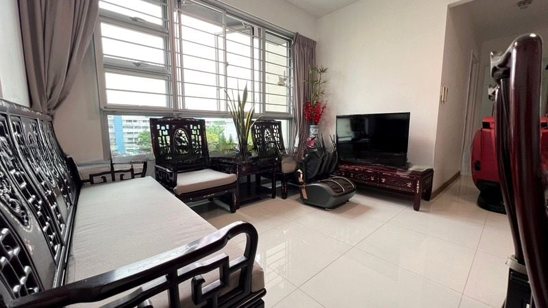 Step into this beautifully maintained 2-bedroom flat and be greeted by an abundance of natural light that fills the spacious living area. The traditional Chinese rosewood-style furniture complements the bright ambiance, creating a warm and inviting atmosphere. Large windows not only enhance the light but also offer a pleasant urban view of the surrounding HDB estate.