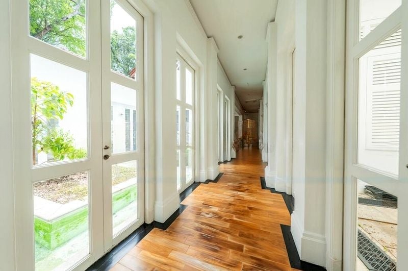 Step into a world of elegance as you enter this stunning colonial home, where abundant natural light floods through arched windows, illuminating the polished wood flooring and highlighting the grandeur of high ceilings. The airy ambiance is complemented by scenic views of the lush tropical garden and the inviting large swimming pool, creating a serene retreat right at your doorstep.