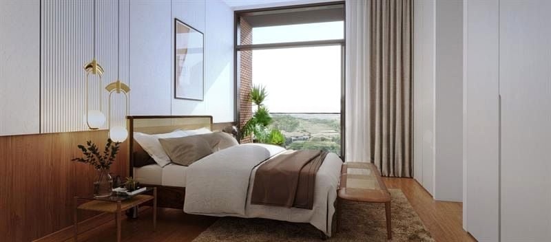 This efficient 2-bedroom layout boasts an open-concept living and dining area, seamlessly integrated with a spacious balcony adorned with planters. The master bedroom features exquisite wood wall paneling and designer pendant lights, while the living room showcases modern furniture and a stunning chandelier. The highlight of this residence is the rooftop infinity pool, complete with submerged lounge chairs and ambient lighting, perfect for relaxation and entertaining.
