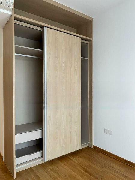 This well-maintained 2-bedroom unit features a thoughtful layout, maximizing space and comfort. The stylish bathroom boasts a vessel sink and a luxurious rain shower, complemented by textured grey wall tiles. The kitchen is a chef's dream with built-in appliances and sleek cabinetry, while the bedrooms are adorned with warm wood flooring and built-in wardrobes, ensuring both functionality and elegance.