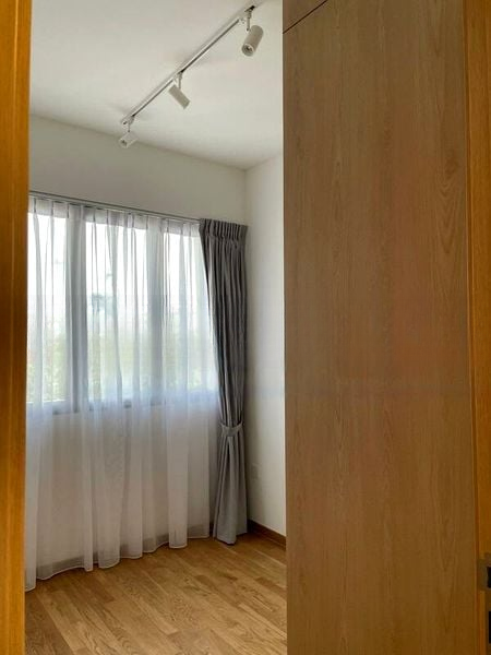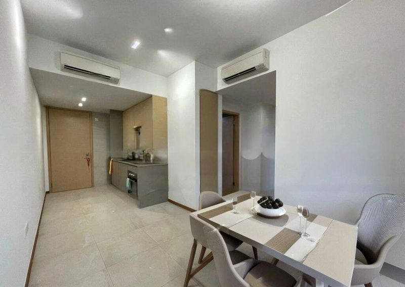 Step into a serene oasis at Harbour View Gardens, where modern minimalism meets nature. The open-concept living and dining area welcomes you with light-colored floor tiles and recessed lighting, creating a bright and airy ambiance. Dual balconies offer refreshing views of lush greenery, inviting the outdoors in and enhancing your living experience.
