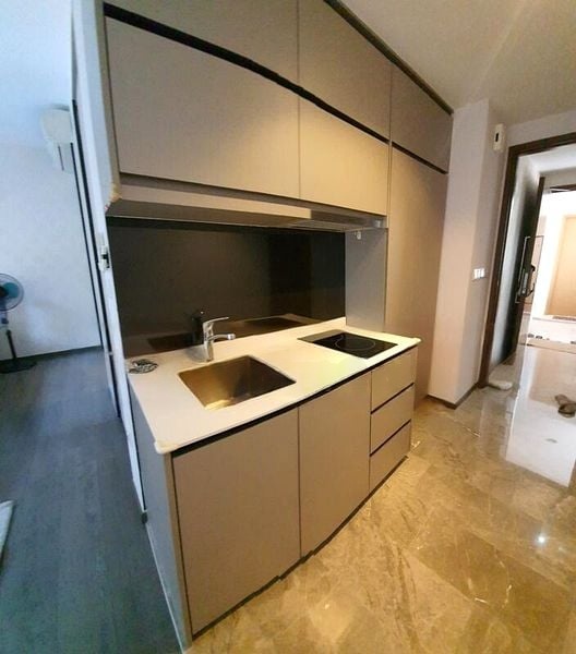 This well-appointed unit features a functional kitchenette equipped with an induction hob and integrated Electrolux washing machine, perfect for the modern lifestyle. The bedroom/living area boasts wood-look laminate flooring, a ceiling fan, and a built-in sliding door wardrobe, ensuring ample storage and comfort. The layout maximizes space, providing a cozy yet stylish environment for both relaxation and productivity.