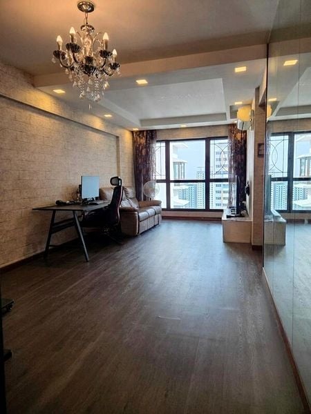 Step into a warm and inviting space where modern comfort meets functionality. The open-concept living room greets you with its stylish brick-patterned wallpaper and a stunning mirrored feature wall that enhances the natural light, creating a cozy ambiance. The chandelier and recessed lighting add a touch of elegance, while the wood-look flooring provides a homely feel, perfect for relaxation.