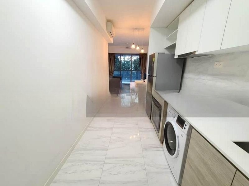 Step into a sanctuary of modern elegance where abundant natural light dances across marble-look floor tiles, creating an inviting ambiance that instantly feels like home. The open-concept living area seamlessly connects to a private balcony, offering serene views of lush greenery, perfect for unwinding after a long day.