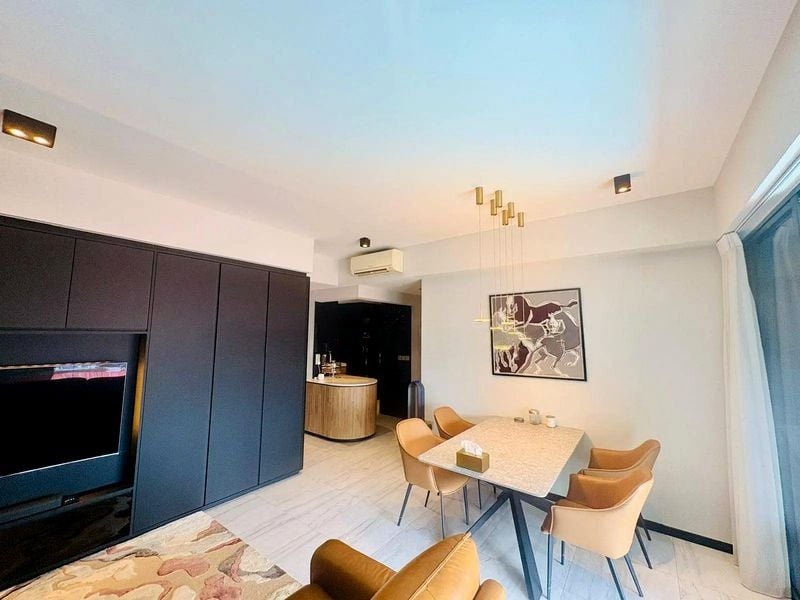 Step into a world of modern minimalist elegance, where abundant natural light floods through full-height sliding glass doors, illuminating the polished floor tiles. The breathtaking views of the infinity-edge pool and city skyline create an inviting ambiance that instantly makes you feel at home.