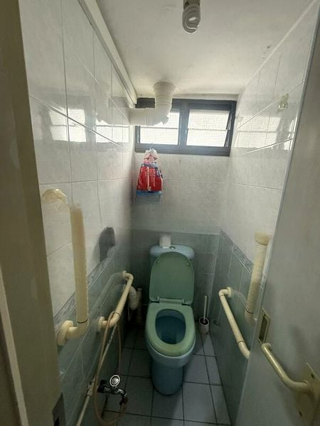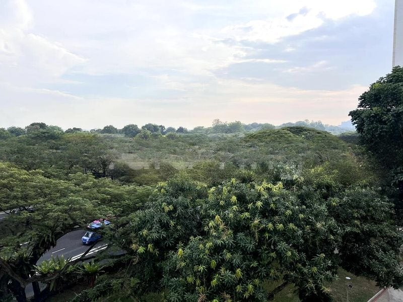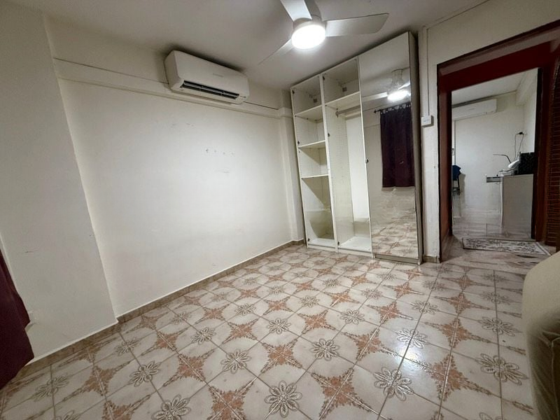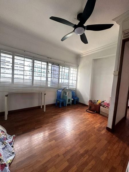 Step into a warm and inviting space where cozy ambiance meets functional design. The living room welcomes you with an L-shaped sectional sofa and a glass coffee table, complemented by white tiled flooring and a ceiling fan that enhances the natural light filtering through the windows. The views of neighboring residential buildings create a sense of community while maintaining privacy.