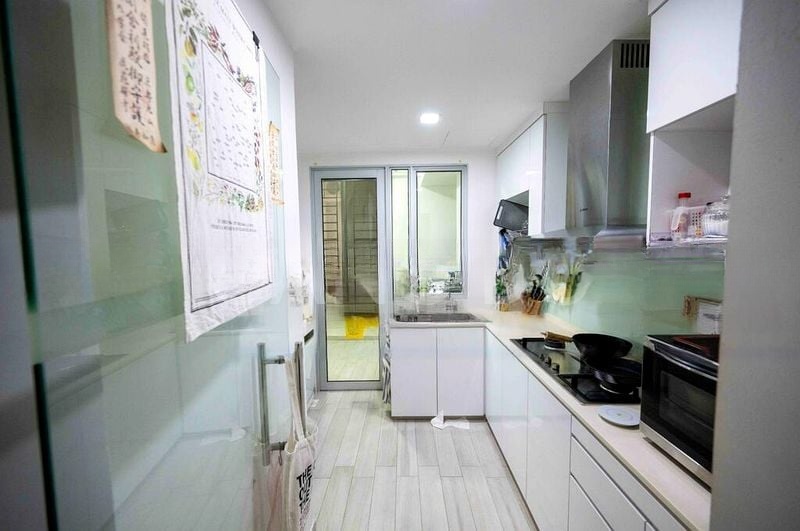 This thoughtfully designed layout features a spacious living room that seamlessly flows into the dining area, adorned with a modern chandelier and a high-top dining set, perfect for entertaining. The kitchen boasts white cabinetry and a U-shaped layout, ensuring both functionality and style. Retreat to the master bedroom, where you’ll find extensive built-in wardrobes and an integrated TV console, complemented by warm wooden flooring and large windows that invite in the morning sun.