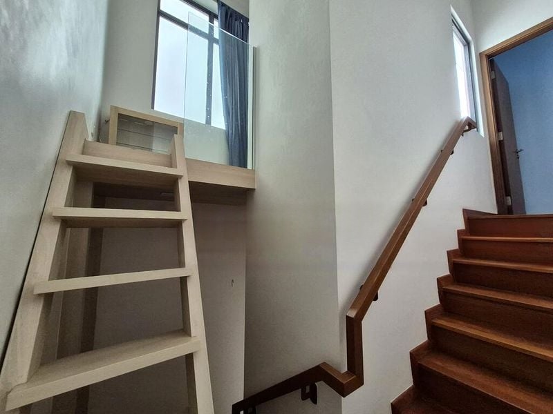 Step into a beautifully maintained unit that exudes modern minimalist charm. The high ceilings and wood-toned laminate finishes create an inviting ambiance, while the recessed ceiling spotlights enhance the natural light filtering through the space. Enjoy urban views from your living area, where a custom-built loft bed and integrated under-stair storage maximize functionality without compromising style.