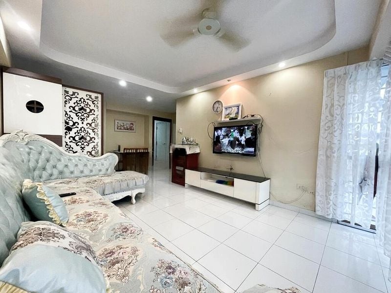 Step into a warm and inviting space where traditional charm meets modern functionality. The living room greets you with a large ornate L-shaped sofa, complemented by a false ceiling adorned with recessed lighting that creates a cozy ambiance. Natural light filters through, enhancing the white tiled flooring and offering a glimpse of the residential views outside.