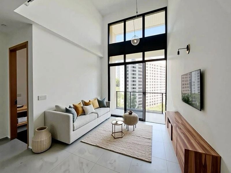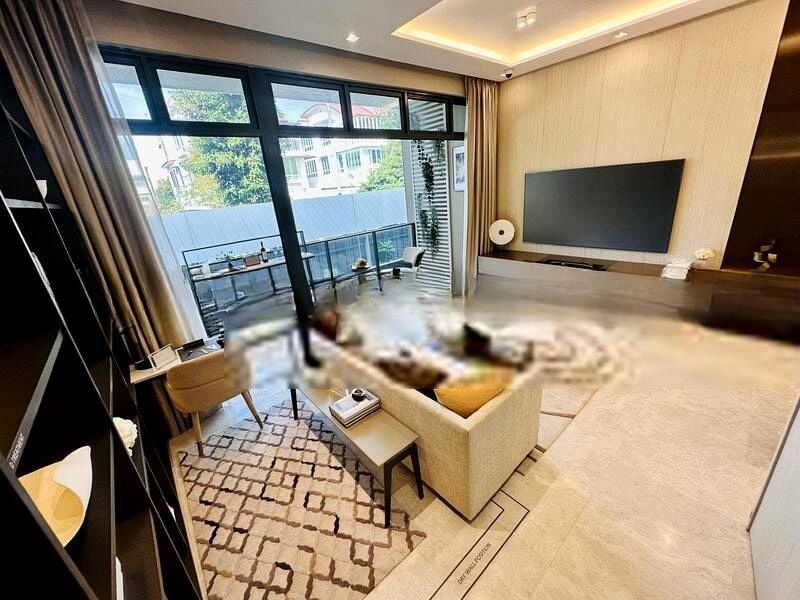Step into a world of modern elegance as you enter this brand-new designer unit at The Arden. Bathed in abundant natural light, the open-plan living area features high ceilings adorned with cove lighting, creating an inviting ambiance. Floor-to-ceiling windows frame picturesque views of lush greenery and the urban landscape, while the stylish furnishings enhance the minimalist aesthetic.