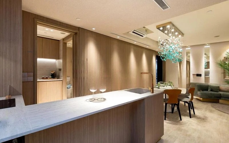 This exquisite 3-bedroom, 2-bathroom unit features a spacious layout that includes a master bedroom with a decorative mirror headboard and walk-in wardrobe access, a stylish kid's bedroom adorned with themed wallpaper, and a study equipped with built-in shelving and a cozy daybed. The heart of the home is the island kitchen, complete with integrated appliances and a striking blue glass chandelier, seamlessly connecting to the dining area. Outside, the large lap pool and sun deck invite relaxation and leisure.