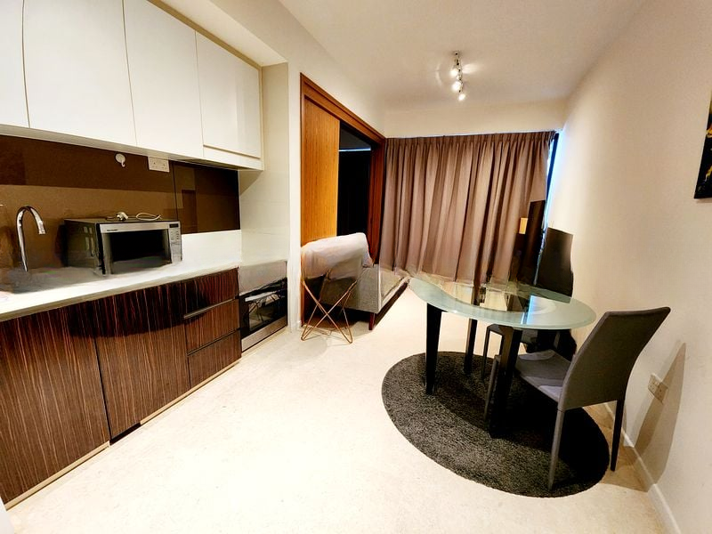 This well-maintained unit features a thoughtful layout, with two spacious bedrooms adorned with wood flooring and built-in wardrobes. The modern kitchen boasts an L-shaped design, integrated oven, and stylish two-tone cabinetry, making it a chef's delight. The bathroom is elegantly finished with grey tiles, a glass shower screen, and a mirrored vanity cabinet, ensuring a touch of luxury in everyday living.