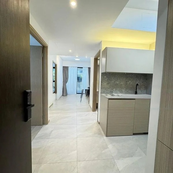 This thoughtfully designed 1-bedroom unit features an open concept layout that maximizes space and functionality. The kitchen boasts stone countertops, an integrated oven, and an induction hob, perfect for culinary enthusiasts. The living area, adorned with large format grey floor tiles, seamlessly connects to the balcony, while the bedroom offers a built-in wardrobe with display shelving and a stylish vanity desk, enhancing both practicality and aesthetics.