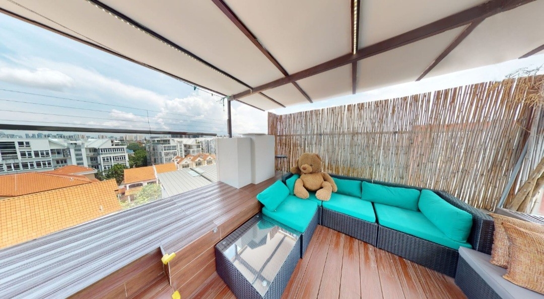 This well-maintained unit boasts a thoughtful layout, featuring a galley kitchen equipped with modern appliances, including an induction hob and integrated oven. Each bedroom is designed for functionality, with built-in study desks and ample storage solutions, including a platform bed with integrated storage. Step outside to the large outdoor terrace, complete with wooden decking and a retractable awning, perfect for entertaining or relaxing in privacy.