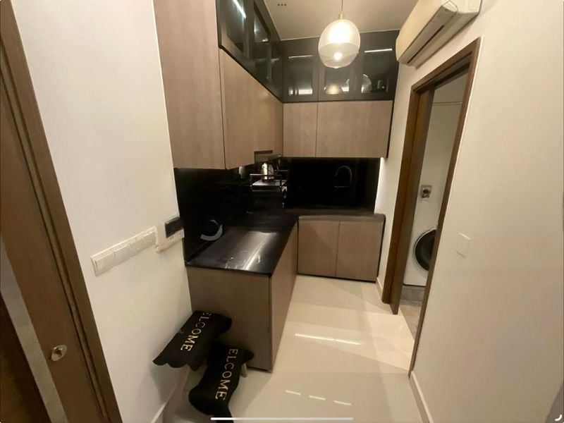 This efficient 1-bedroom unit features a compact yet functional layout, with a sliding glass door leading from the bedroom to the balcony. The living room boasts an open concept design, complemented by a wall-mounted air conditioning unit and a stylish wooden TV console. The kitchenette is equipped with dark wood-grain cabinets, a built-in gas hob, and a stainless steel sink, catering to all your culinary needs.