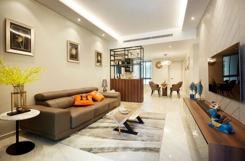 This well-maintained 4-bedroom condominium features an open-concept living room with a stylish built-in TV console and designer lighting, seamlessly flowing into a modern dining area highlighted by a decorative partition. The contemporary kitchen boasts a breakfast bar with white countertops, perfect for casual dining, while the elegant marble-top side table adds a touch of sophistication.