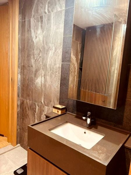 This well-maintained 2-bedroom, 2-bathroom unit features standout elements such as a luxurious rain shower, a spacious lap pool, and a contemporary kitchen equipped with a built-in oven and light wood grain cabinetry. The minimalist design extends to the living room, where modern furniture and a wall-mounted large screen TV create a stylish yet comfortable space, perfect for relaxation or entertaining guests.