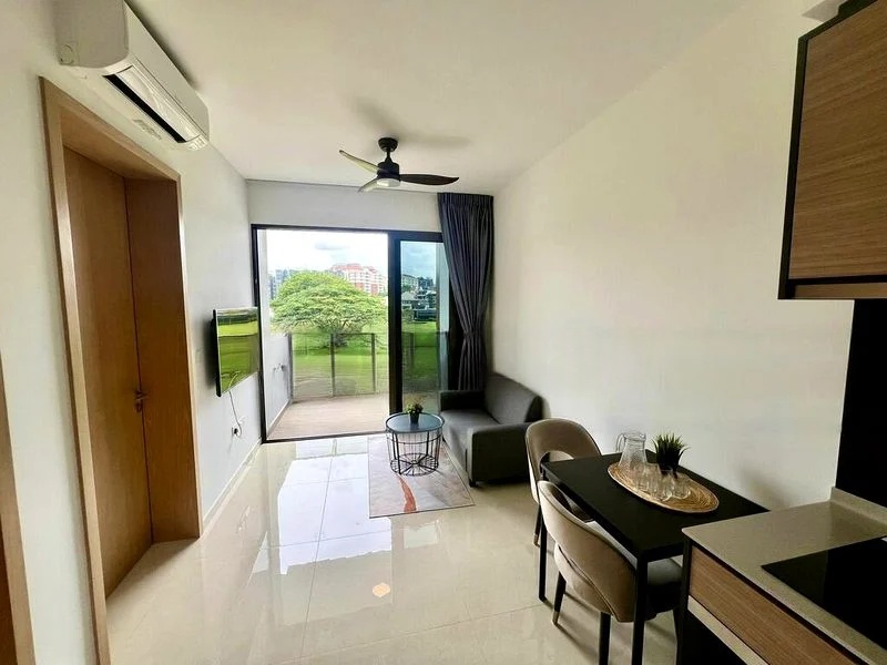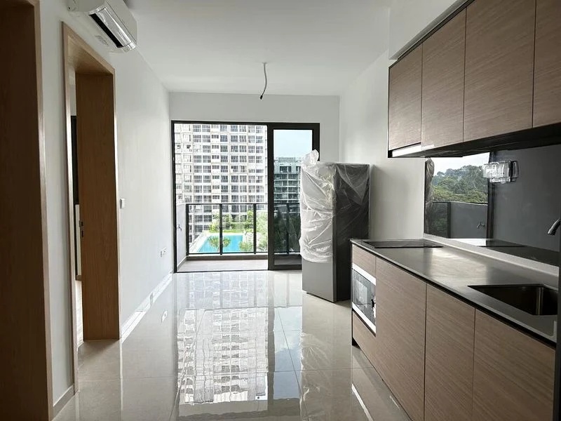 Step into a world of modern elegance as you enter this beautifully renovated unit at MIDWOOD. Bathed in abundant natural light, the open layout showcases sleek finishes and a harmonious blend of indoor and outdoor living. Enjoy breathtaking views of the pool and city skyline from your high-floor balcony, framed by adjustable wooden louvers that enhance the serene ambiance.