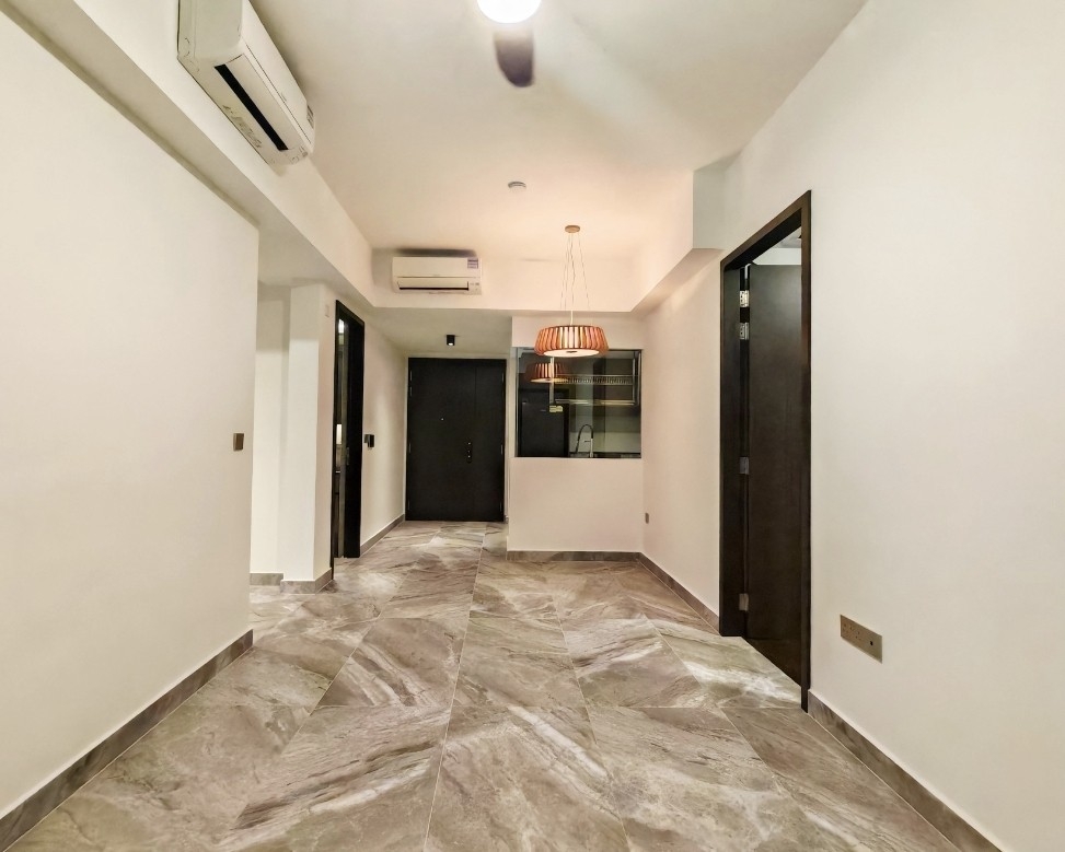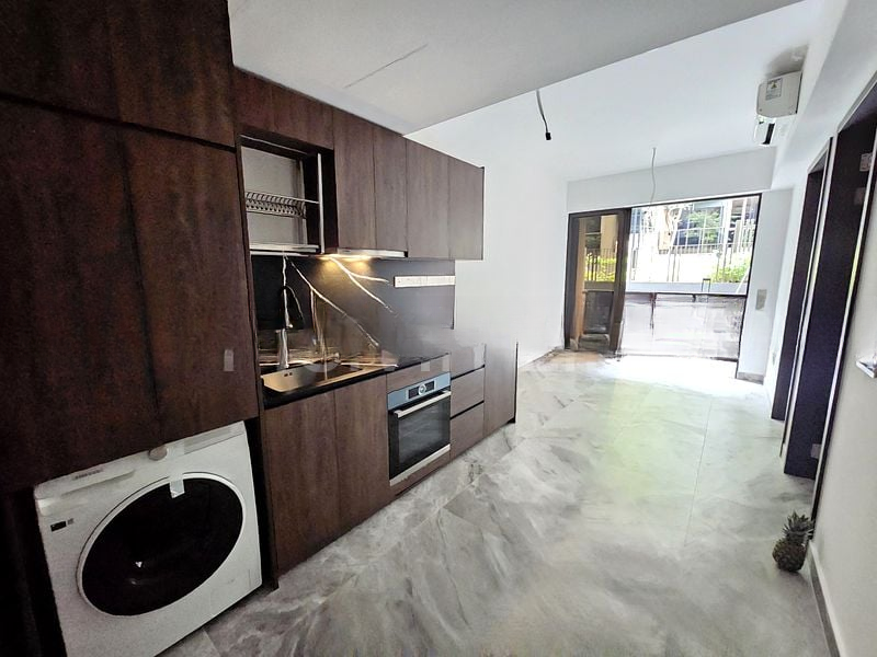 Step into a world of contemporary elegance as you enter this brand-new unit at The Commodore. The modern minimalist design is accentuated by marble-look floor tiles that reflect natural light, creating a bright and inviting atmosphere. Enjoy serene views of lush greenery from your living area, complemented by the sleek finishes and under-cabinet LED lighting that enhance the ambiance.