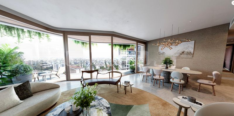 The open-plan layout seamlessly integrates the living and dining areas, featuring a striking marble TV feature wall and an oval marble dining table surrounded by designer chairs. The floral mural accent wall adds a touch of sophistication, while the large balcony with integrated greenery offers a perfect outdoor retreat with lounge seating, ideal for entertaining or enjoying quiet moments.