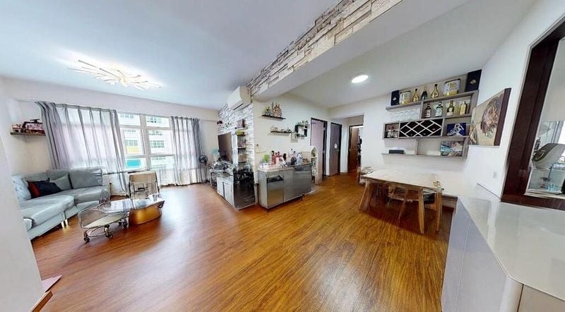 Step into this beautifully renovated HDB flat and be greeted by a warm, inviting atmosphere. The open-concept living and dining area boasts a stunning textured stone feature wall, complemented by a built-in wine display cabinet that adds a touch of sophistication. Natural light filters through large windows, creating a cozy environment perfect for relaxation or entertaining.