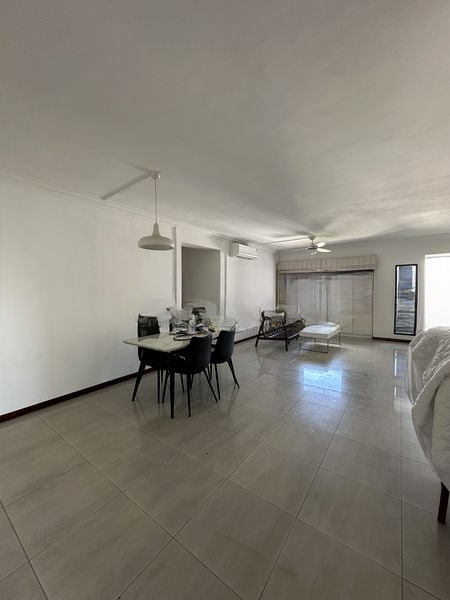 Step into a well-maintained sanctuary where simplicity meets functionality. The open-concept living and dining area welcomes you with its bright white tiled flooring and a ceiling fan, creating a refreshing ambiance. Natural light filters through the space, complemented by views of neighboring greenery and residential blocks that evoke a sense of calm.