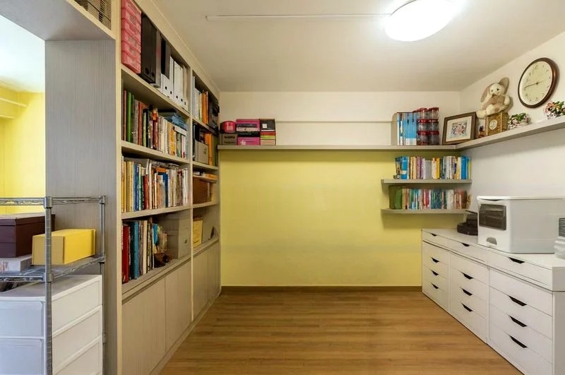 This efficient layout features a dedicated kitchen with stylish two-tone cabinetry, complemented by beige countertops and a decorative backsplash. The bedroom boasts a bold red accent wall and a chandelier-style light fixture, providing a cozy retreat with large white-framed windows that invite in the light. A household shelter adds practicality, ensuring you have all the storage you need.