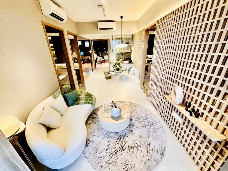 Step into a world of elegance and comfort as you enter this brand-new designer unit at Kassia. The abundant natural light floods through the floor-to-ceiling windows, illuminating the cozy ambiance created by the warm wood lattice feature wall and the inviting curved designer sofa. The open concept layout seamlessly connects the living and dining areas, making it perfect for entertaining or relaxing while enjoying serene views of lush greenery.