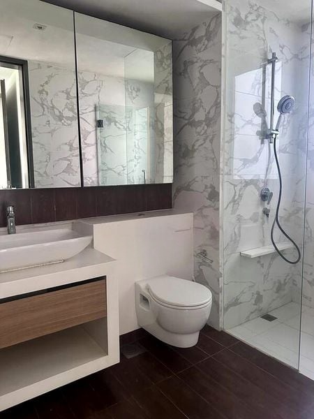Step into a world of modern elegance as you enter this beautifully designed 3-bedroom unit at Jewel @ Buangkok. The spacious living area greets you with an L-shaped grey sofa, complemented by track lighting and a wooden ceiling fan that creates a warm ambiance. Natural light filters through white sheer curtains, enhancing the minimalist aesthetic, while a large wall mirror in the dining area reflects the stylish modern globe chandelier above the marble-look dining table, making it perfect for entertaining.