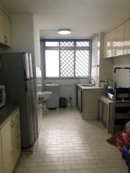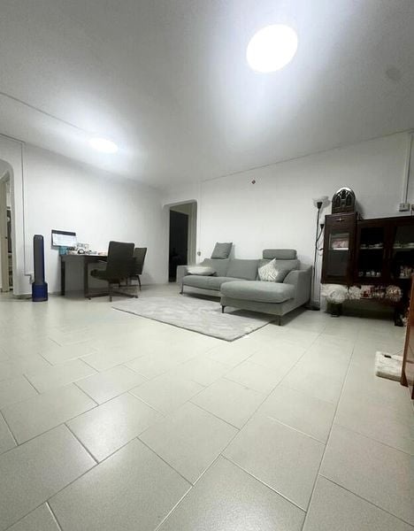 Step into a world of nostalgia as you enter this charming HDB flat, where the vintage patterned floor tiles and ceiling fans create a warm and inviting ambiance. The living and dining area is bathed in moderate natural light, offering a functional space that feels both homey and practical. Enjoy views of the neighboring buildings while appreciating the original finishes that tell a story of timeless simplicity.