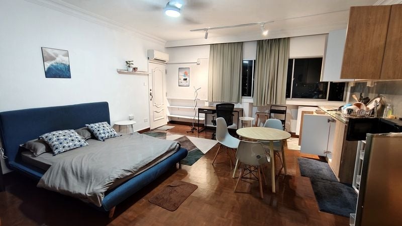 This spacious 4-bedroom unit boasts standout features including a well-appointed master bedroom with a large wooden display cabinet and a dedicated vanity area. The second bedroom offers built-in glossy wardrobes and an integrated TV niche, while the versatile study/guest room is bathed in natural light, providing a perfect retreat. The dining area, seamlessly connected to the living space, showcases striking wall art and is ideal for hosting gatherings.