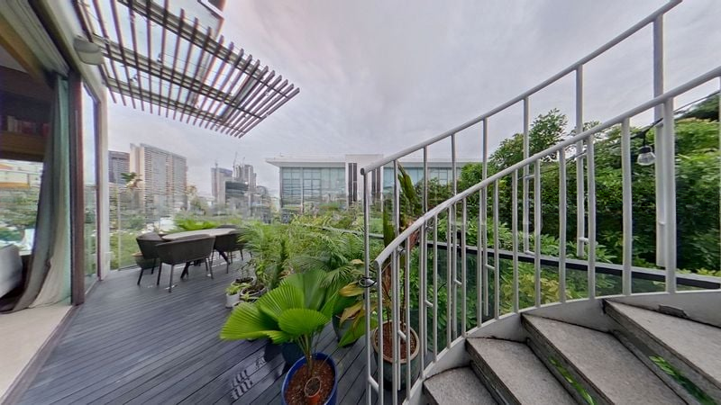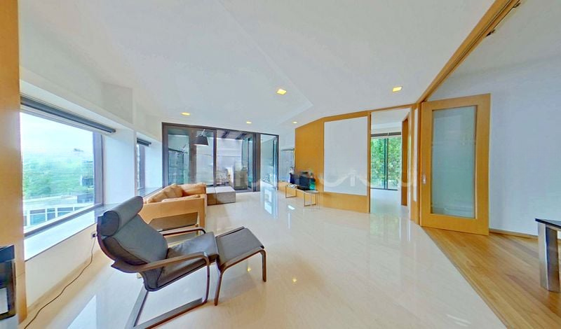 This meticulously maintained unit features standout elements such as curved feature walls and a stunning spiral staircase leading to a private balcony. The open-concept living room seamlessly connects to the dining area, which is perfect for entertaining with its 8-seater dining table and designer pendant lighting. A dedicated study with tree-top views adds a touch of tranquility to your work-from-home experience.