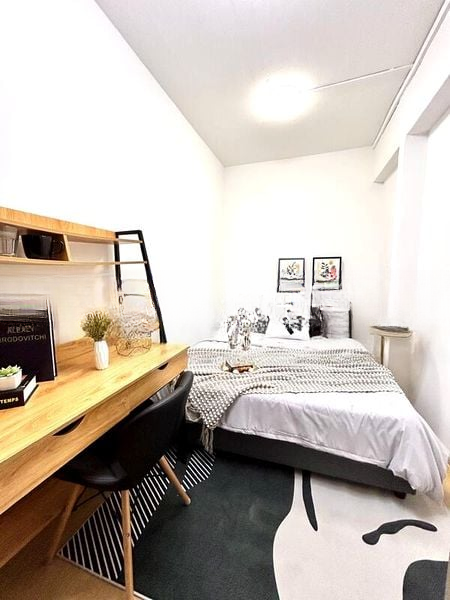 This well-maintained unit features a thoughtfully designed space, including a cozy bedroom area with a sliding mirror wardrobe and a wooden study desk, perfect for productivity. The kitchenette boasts modern appliances, including a black refrigerator and a front-loading Samsung washing machine, complemented by a wall-mounted dining nook that maximizes space. Enjoy the convenience of integrated lighting and a ceiling fan that enhances the contemporary feel of the home.